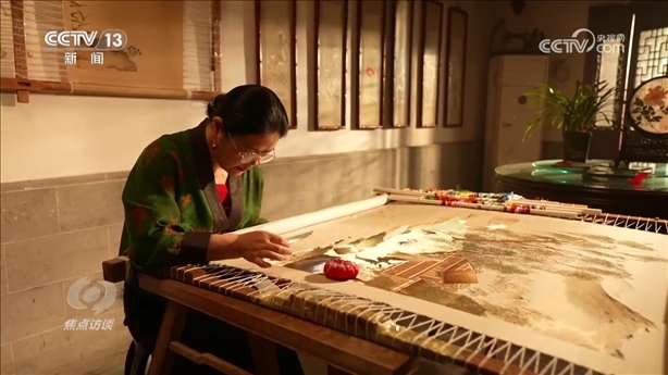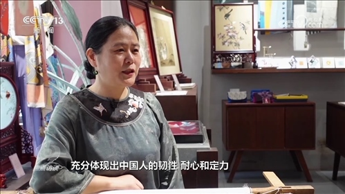 盧建英:“當時我在繡一幅《桃花太平鳥圖》,習近平總書記走到了我的繃架前。他說你好,很親切,很和藹,看得非常仔細。他說中華文化的傳承力有多強,通過這個蘇繡可以看出來,像這樣的功夫充分體現(xiàn)出中國人的韌性、耐心和定力,這是中華民族精神的一部分,能得到總書記的認可,真的是倍感榮耀。”
