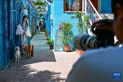 在伊犁哈薩克自治州伊寧市六星街,游客體驗(yàn)旅拍項(xiàng)目。