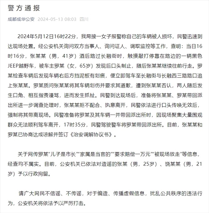 ·女子要求“觸摸”其車男子賠1萬并叫囂“兒子是市長”?成都警方:均不屬實(shí),造謠者已被行拘。