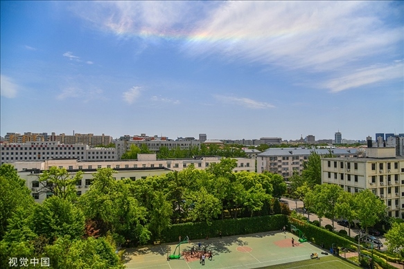5月14日中午,北京南方天空出現(xiàn)罕見的環(huán)地平弧天象,彩虹一般的七彩祥云下市民正在球場(chǎng)上運(yùn)動(dòng)。