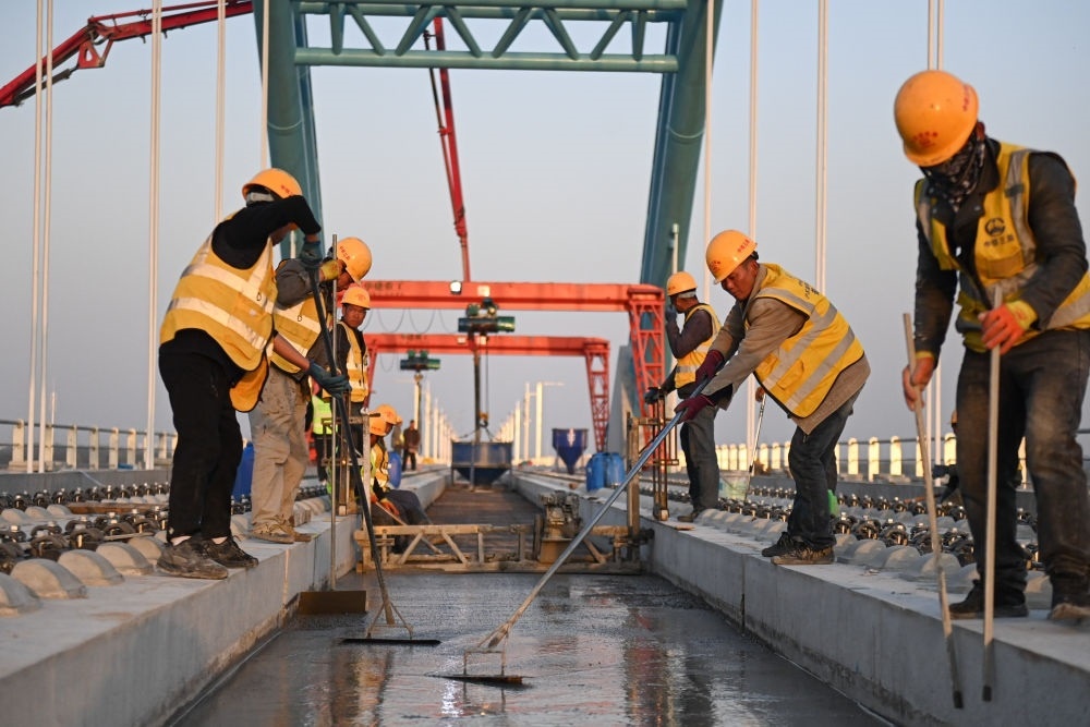 2024年3月20日,中鐵三局建設(shè)者在滬蘇湖鐵路東苕溪特大橋上施工。滬蘇湖鐵路起自上海虹橋站,途經(jīng)江蘇省蘇州市,終至浙江省湖州市湖州站。項目建成運營后,將進一步完善區(qū)域路網(wǎng)布局,促進沿線經(jīng)濟社會發(fā)展和長三角一體化高質(zhì)量發(fā)展。新華社記者 黃宗治 攝