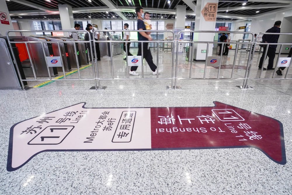 2023年6月24日,乘客在蘇州軌道交通11號線花橋站進站乘車。當(dāng)日,蘇州軌道交通11號線正式投入運營,并與上海軌道交通11號線實現(xiàn)無縫換乘,長三角核心城市間首次實現(xiàn)地鐵系統(tǒng)跨省互聯(lián)互通。新華社記者 李博 攝