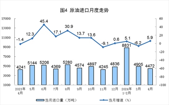 原油生產(chǎn)平穩(wěn)增長,進口由降轉(zhuǎn)增。4月份,規(guī)上工業(yè)原油產(chǎn)量1747萬噸,同比增長1.3%,增速比3月份加快0.1個百分點;日均產(chǎn)量58.2萬噸。進口原油4472萬噸,同比增長5.9%。