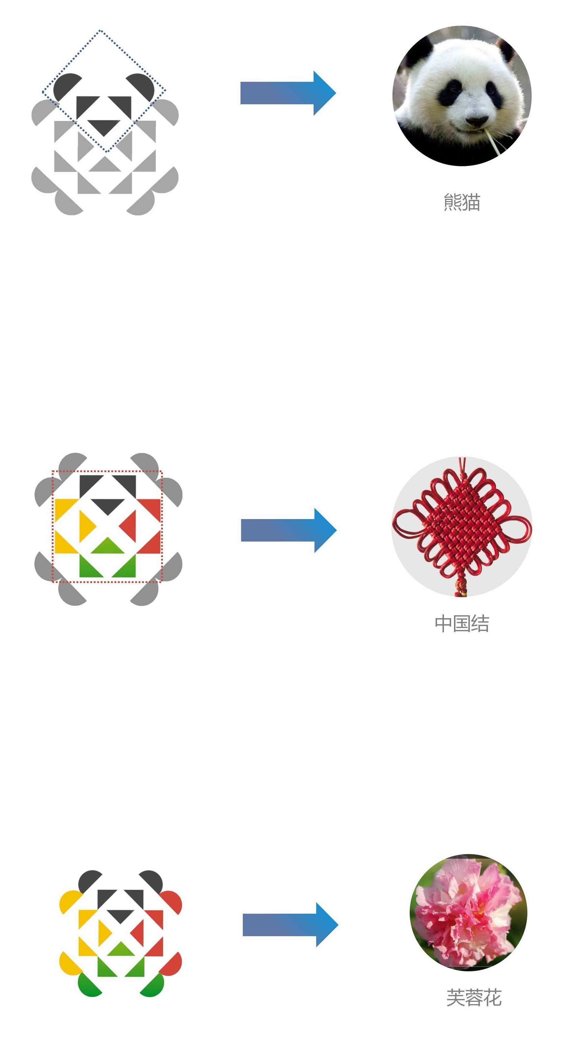 會徽設計靈感源于中國的大熊貓、芙蓉花和中國結,以中國紅、金沙黃、公園綠、熊貓黑、雪山白為主色調(diào)。作為 2025 年成都世界運動會的重要標志,這一會徽有效傳達了奧林匹克精神又凸顯了中國傳統(tǒng)元素和成都特色,彰顯了“團結、包容、多樣性”的價值觀。同時,設計師秉承色彩明快、造型簡潔的設計理念,其外圍的半圓圖案和內(nèi)部排列的三角形,圍成一朵盛開的芙蓉花;紅、黑、黃、綠、白的幾何色塊拼出可愛的卡通大熊貓。