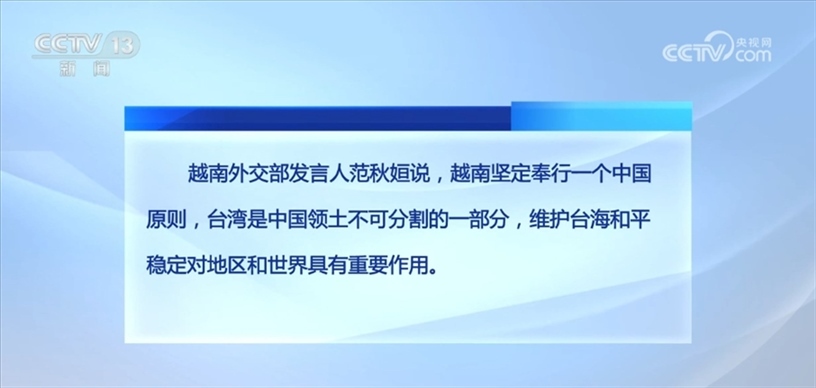 越南外交部發(fā)言人范秋姮說(shuō),越南堅(jiān)定奉行一個(gè)中國(guó)原則,臺(tái)灣是中國(guó)領(lǐng)土不可分割的一部分,維護(hù)臺(tái)海和平穩(wěn)定對(duì)地區(qū)和世界具有重要作用。