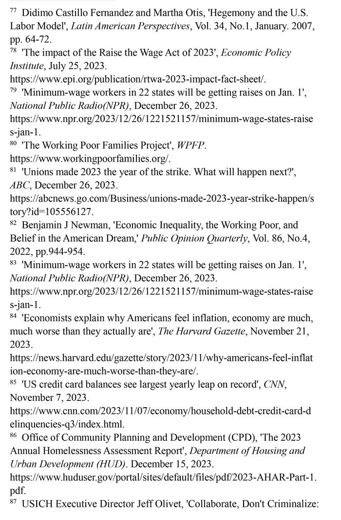 “工作者貧困”問題突出。美國勞動力市場狀況發(fā)生了結(jié)構(gòu)性變化,低薪崗位和缺乏監(jiān)管普遍存在。(注77)有大批“工作窮人”終日勞作,其工資水平卻難以維持基本生計,還缺乏應(yīng)有的社會保障。美國聯(lián)邦最低時薪標(biāo)準(zhǔn)自2009年以來一直沒有上調(diào)。(注78)美國勞工部的數(shù)據(jù)顯示,2023年仍有20個州維持聯(lián)邦最低時薪標(biāo)準(zhǔn)。(注79)美國有1150萬個低收入工薪家庭,包括1480萬兒童在內(nèi)的2990多萬美國人生活在這些低收入工薪家庭。(注80)勞資收入增長懸殊導(dǎo)致多行業(yè)大面積罷工。2023年,美國發(fā)生了21世紀(jì)以來波及范圍最廣的罷工潮,包括影視、制造、醫(yī)療、媒體在內(nèi)的多個行業(yè)都出現(xiàn)大規(guī)模罷工。(注81)加利福尼亞州大學(xué)公共政策與政治學(xué)院副教授本杰明·紐曼評論稱,陷入結(jié)構(gòu)性貧困之中的“工作窮人”既缺乏機(jī)會平等,也難以向上流動,他們極大地降低了對“美國夢”的信念。(注82)