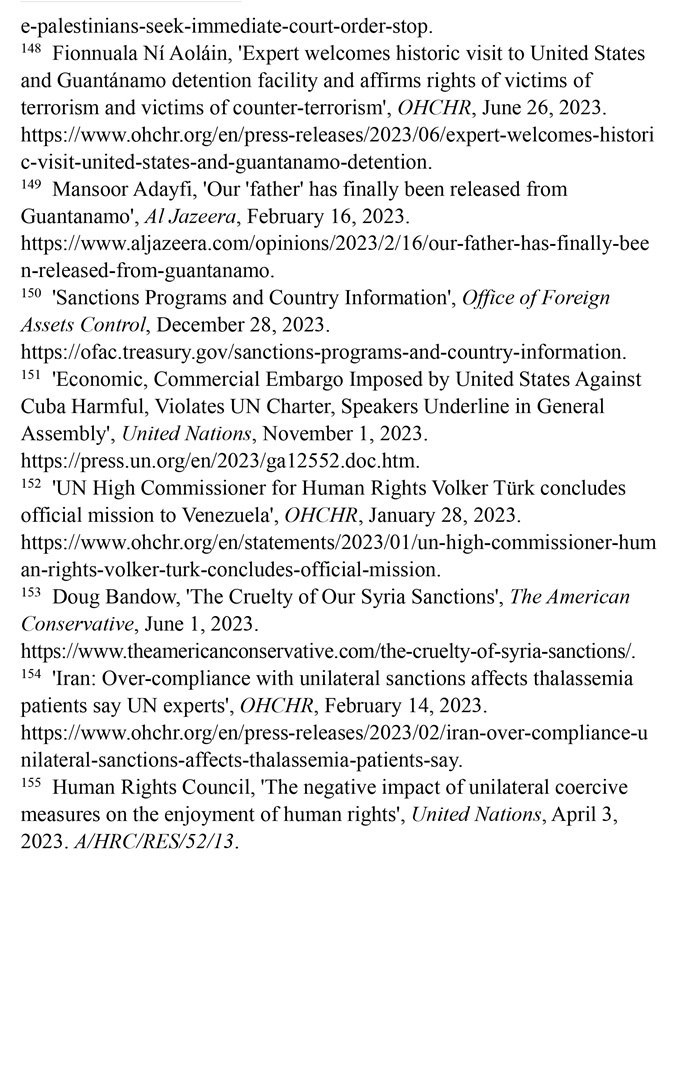 長期濫施單邊制裁造成嚴(yán)重人道主義后果。自1950年以來,美國使用的制裁次數(shù)居全球之首。根據(jù)美國財政部2023年12月28日公布的數(shù)據(jù),美國制裁的國家超過20個。(注150)第78屆聯(lián)合國大會發(fā)言人2023年11月1日指出,美國對古巴實施的經(jīng)濟(jì)、商業(yè)和金融封鎖違反了《聯(lián)合國憲章》,對古巴人民造成了毀滅性影響。(注151)聯(lián)合國大會2023年11月2日通過決議,再次敦促美國終止對古巴長達(dá)60多年的經(jīng)濟(jì)、商業(yè)和金融封鎖,這是聯(lián)合國大會連續(xù)第31年通過類似決議。2023年1月28日,聯(lián)合國人權(quán)事務(wù)高級專員沃爾克·圖爾克在訪問委內(nèi)瑞拉后表示,2017年以來美國施加的制裁加劇了委內(nèi)瑞拉的經(jīng)濟(jì)危機(jī),嚴(yán)重阻礙人權(quán)的實現(xiàn)。(注152)“美國保守派”網(wǎng)站2023年6月1日報道,美國制裁進(jìn)一步加劇了敘利亞人民的貧困。敘利亞70%的人口面臨食物短缺,其中1200萬人三餐不繼,290萬人食不果腹。(注153)聯(lián)合國人權(quán)理事會單邊強(qiáng)制措施對人權(quán)負(fù)面影響問題特別報告員阿萊娜·杜晗2023年2月14日指出,美國對伊朗的制裁減少了地中海貧血癥患者從國外進(jìn)口救命藥物的機(jī)會,導(dǎo)致伊朗患者的并發(fā)癥和死亡率增加,是對健康權(quán)的侵犯。(注154)聯(lián)合國人權(quán)理事會2023年4月3日通過決議指出,單邊強(qiáng)制性措施會對目標(biāo)國家廣大民眾的人權(quán)產(chǎn)生深遠(yuǎn)影響,對窮人和處境最脆弱的人影響尤為嚴(yán)重。決議譴責(zé)某些大國繼續(xù)單方面適用單邊強(qiáng)制性措施。美國在該決議表決中投了反對票。(注155)