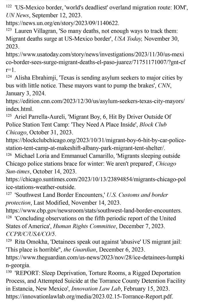 入境移民遭受酷刑及其他不人道待遇。2023財年,在美國南部邊境遭逮捕或驅(qū)逐的移民總數(shù)達(dá)240多萬人,再創(chuàng)歷史新高。(注127)聯(lián)合國人權(quán)事務(wù)委員會對移民在美國受到長時間的拘留表示擔(dān)憂,批評美國的拘留所條件惡劣,人滿為患,被拘押者無法獲得食物、水和醫(yī)療服務(wù),導(dǎo)致包括兒童在內(nèi)的許多人死亡;公共和私營移民拘留設(shè)施存在性暴力、長期單獨監(jiān)禁、虐待等侵犯人權(quán)問題。(注128)英國《衛(wèi)報》網(wǎng)站2023年12月6日報道,由美國私人監(jiān)獄公司CoreCivic運(yùn)營的、位于佐治亞州蘭普金的斯圖爾特拘留中心存在長期單獨監(jiān)禁、性虐待、醫(yī)療疏忽以及強(qiáng)迫勞動等令人擔(dān)憂的問題。(注129)創(chuàng)新法律實驗室于2023年2月15日發(fā)布報告揭露,由CoreCivic運(yùn)營的、位于新墨西哥州埃斯坦西亞的托蘭斯縣拘留所存在對被關(guān)押者實施酷刑現(xiàn)象。在夜間,每隔15分鐘就會有一名警衛(wèi)開著收音機(jī)的最大音量走過這些房間,大聲地敲著門,并用手電筒強(qiáng)光照進(jìn)房間,吵醒任何可能睡著的人。在寒冷的天氣里,每個房間的通風(fēng)管道整夜都在吹冷空氣。一些人試圖用衛(wèi)生紙或毯子蓋住通風(fēng)口,但警衛(wèi)們拿走了用來阻擋冷空氣的任何東西。這些牢房里,廁所污水和糞便溢出,人們被迫睡在臭氣熏天的地板上。(注130)
