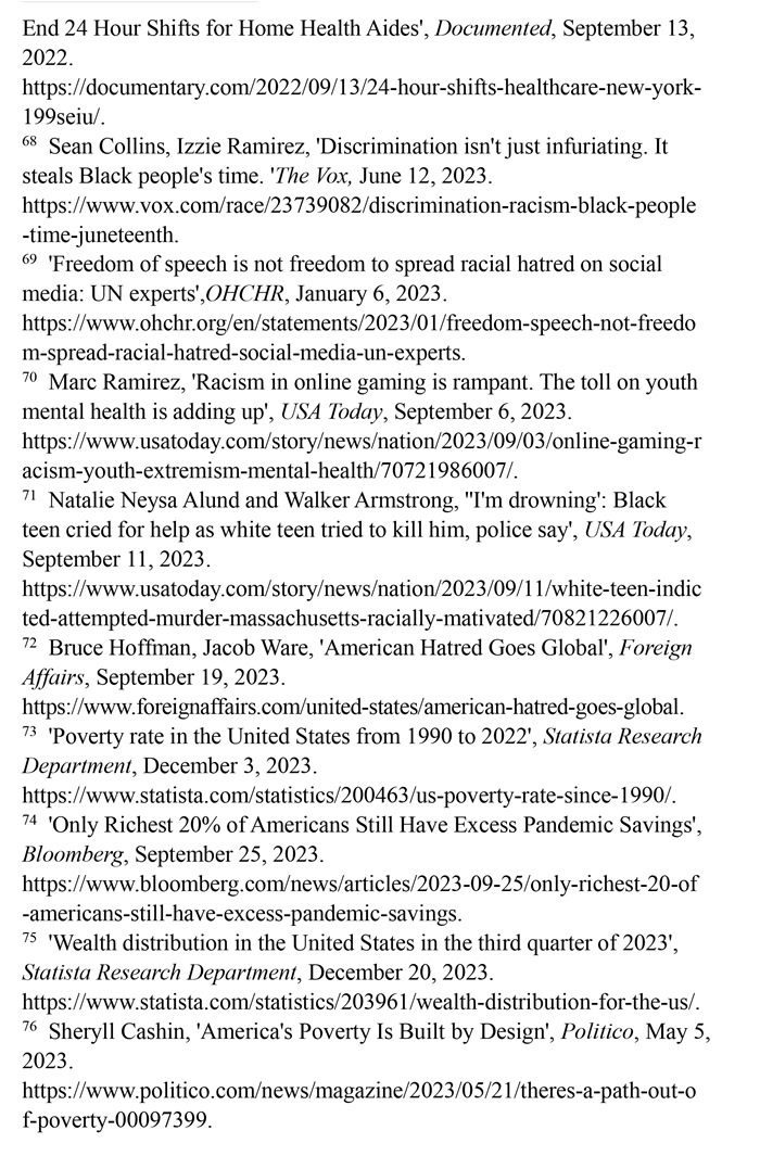 少數(shù)族裔遭遇職場歧視。美國一家名為“溫室”的招聘軟件公司發(fā)布的《2023年求職者面試經(jīng)歷報告》顯示,招聘過程中的歧視現(xiàn)象“相當(dāng)令人擔(dān)憂”。34%的求職者在面試中遇到過歧視性問題,近1/5的求職者曾試圖通過在簡歷中更改姓名,以避免受歧視性招聘行為的影響。在改名的求職者中,有45%是為了讓自己聽起來“不那么有族裔特點”。(注65)英國《衛(wèi)報》網(wǎng)站2023年4月23日披露,美國政府?dāng)?shù)十年來刻意逃避勞工保護(hù)責(zé)任,壓榨少數(shù)族裔勞工。紐約的有色族裔護(hù)工不僅被迫接受連續(xù)長時間的工作,薪資還受到克扣。不少護(hù)工因此罹患失眠、慢性病等疾病,對護(hù)工及其家庭造成嚴(yán)重傷害。(注66)少數(shù)族裔勞工一直嘗試通過各種渠道爭取權(quán)利保障,但在一些利益集團(tuán)阻礙下成效寥寥。(注67)沃克斯新聞網(wǎng)2023年6月12日報道,在美國,非洲裔一直比白人掙得少。這種差異意味著在種族歧視的影響下,非洲裔時間價值明顯低于白人,為了彌補(bǔ)歧視造成的工資差距,非洲裔工人每天必須多工作2.7小時。(注68)