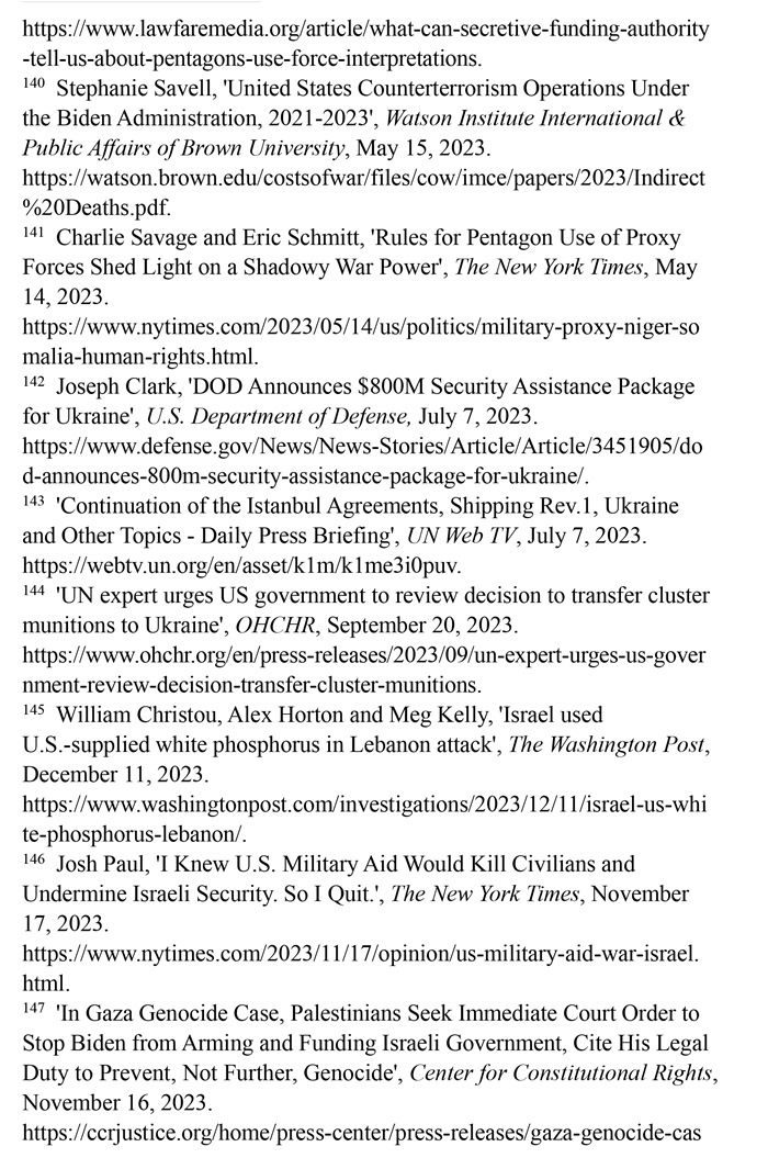 持續(xù)向沖突地區(qū)提供武器。美國國防部2023年7月7日發(fā)布的新聞稿顯示,美國向烏克蘭提供的價值8億美元的額外軍事援助中,包含大量集束彈藥。(注142)聯(lián)合國秘書長副發(fā)言人哈克2023年7月7日回答記者提問時表示,聯(lián)合國秘書長安東尼奧·古特雷斯希望各國遵守《集束彈藥公約》,不要在戰(zhàn)場上繼續(xù)使用集束彈藥。(注143)聯(lián)合國人權(quán)高專辦網(wǎng)站2023年9月20日報道,聯(lián)合國人權(quán)理事會酷刑和其他殘忍、不人道或有辱人格的待遇或處罰問題特別報告員愛麗絲·吉爾·愛德華茲2023年7月向美國政府發(fā)出緊急信函,警告集束彈藥會對平民造成嚴(yán)重傷害。(注144)《華盛頓郵報》網(wǎng)站2023年12月11日報道,美國每年流入以色列的軍火達(dá)數(shù)十億美元,以色列在10月對黎巴嫩南部的一次襲擊中使用了美國供應(yīng)的白磷彈藥,造成至少9名平民受傷。(注145)美國國務(wù)院政治軍事事務(wù)局前局長喬?!けA_2023年10月18日在《紐約時報》網(wǎng)站發(fā)表專欄文章指出,美國每年向以色列提供至少38億美元軍事援助,加沙地帶最嚴(yán)重的人員傷亡大多是由美國提供的彈藥所導(dǎo)致,譴責(zé)這種軍事援助無視人權(quán)問題。(注146)美國人權(quán)組織“憲法權(quán)利中心”2023年11月16日報道,滅絕種族與死刑問題專家威廉·沙巴斯指責(zé)美國未能履行防止種族滅絕的法律義務(wù),違反了習(xí)慣國際法和《防止及懲治滅絕種族罪公約》。(注147)