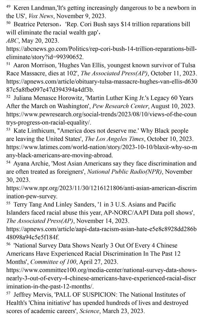 對非洲裔種族迫害的賠償遙遙無期。美國南北戰(zhàn)爭結(jié)束不久后,美國政府承諾向曾被奴役的每一個非洲裔家庭進(jìn)行賠償,但一百多年來這一承諾從未兌現(xiàn)。1989年,美國眾議院非洲裔議員約翰·科尼爾斯提出“研究和制定非洲裔美國人賠償提案委員會法案”(H.R.40法案),但這一法案數(shù)十年來從未進(jìn)入過國會表決程序。(注50)1921年,美國俄克拉何馬州塔爾薩地區(qū)發(fā)生針對非洲裔的種族屠殺事件,導(dǎo)致數(shù)百人遇害。為塔爾薩大屠殺最后3位已知幸存者爭取賠償?shù)脑V訟仍未定案,而其中年齡最低的幸存者休斯·范·埃利斯已于2023年10月去世。(注51)皮尤研究中心2023年8月10日發(fā)表的報告顯示,83%的非洲裔美國人表示,美國政府所做的確保平等的努力還遠(yuǎn)遠(yuǎn)不夠。(注52)許多不滿美國政治和種族歧視的非洲裔選擇離開。離開美國的非洲裔在葡萄牙、加納、哥倫比亞和墨西哥等地建立了新的社區(qū),這已然成為一種名為“Blaxit”的潮流(“Black”和“exit”的結(jié)合),并在社交媒體上廣泛流傳。他們高呼:“美國配不上我!”(注53)