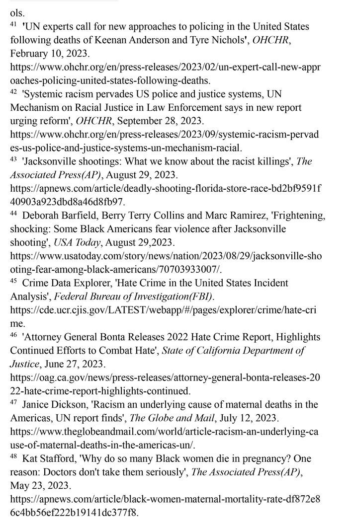 非洲裔在執(zhí)法領(lǐng)域面臨嚴(yán)重種族歧視。2023年1月3日,洛杉磯31歲的非洲裔男子基南·安德森涉嫌交通肇事,警方在制服他的過程中使用電擊槍擊中其6次,致其心臟病發(fā),送醫(yī)不治身亡。(注39)2023年1月7日,田納西州孟菲斯市的警察以“魯莽駕駛”為由將29歲的非洲裔男子泰爾·尼科爾斯攔下,并對其進(jìn)行長達(dá)數(shù)分鐘的殘忍毆打。三天后尼科爾斯因傷勢過重去世,而事后的調(diào)查無法證實警察關(guān)于其“魯莽駕駛”的說法。(注40)這兩起非洲裔遭受警察暴力執(zhí)法身亡案例引發(fā)多名聯(lián)合國專家的高度關(guān)注。專家們強(qiáng)調(diào),在兩起事件中,警察使用的武力違反保護(hù)生命權(quán),禁止酷刑和其他殘忍、不人道或有辱人格待遇或處罰的國際準(zhǔn)則,也不符合聯(lián)合國《執(zhí)法人員行為守則》和《執(zhí)法人員使用武力和火器的基本原則》。(注41)聯(lián)合國人權(quán)理事會在執(zhí)法工作中推進(jìn)種族正義和平等的國際獨立專家機(jī)制在對美國實地訪問后發(fā)布報告指出,針對非洲裔的系統(tǒng)性種族主義已經(jīng)滲透到美國警察隊伍和刑事司法系統(tǒng)。非洲裔被警察殺害的可能性是白人的3倍,被監(jiān)禁的可能性是白人的4.5倍。在每年1000多起警察殺人案件中,只有1%的涉事警察被指控。報告警告說,美國如果不按照國際標(biāo)準(zhǔn)改革警察使用武力的規(guī)則,許多殺戮將繼續(xù)發(fā)生。(注42)