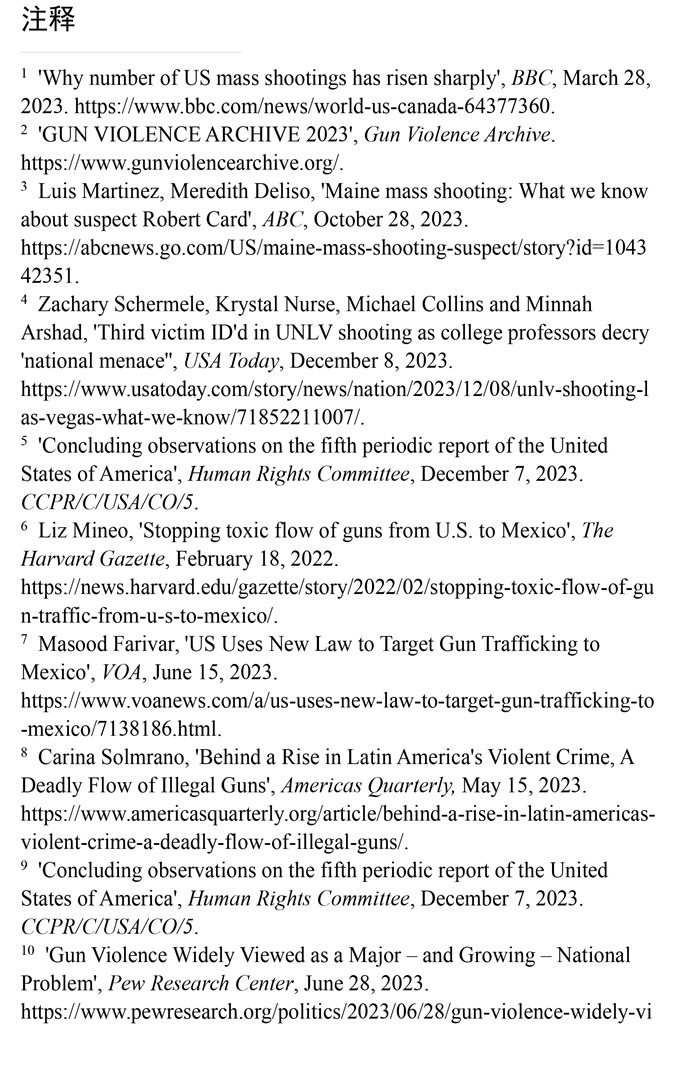 槍支暴力造成慘痛生命代價。數(shù)據(jù)顯示,美國所有類型的槍支暴力事件都呈上升趨勢。(注1)根據(jù)“槍支暴力檔案”網(wǎng)站統(tǒng)計的數(shù)據(jù),2023年美國至少發(fā)生了654起大規(guī)模槍擊事件。槍支暴力導(dǎo)致近4.3萬人死亡,平均每天死亡117人。(注2)例如,美國廣播公司新聞網(wǎng)站2023年10月28日報道,緬因州發(fā)生大規(guī)模槍擊事件,造成至少18人死亡,13人受傷。(注3)《今日美國報》網(wǎng)站2023年12月6日報道,拉斯維加斯3名大學(xué)教授被一名前同事槍殺。美國大學(xué)教授協(xié)會主席艾琳·馬爾維稱,槍支暴力是“不可接受的國家威脅”,敦促美國政府進(jìn)行槍支政策改革。(注4)美國與槍支有關(guān)的傷亡人數(shù)激增,引發(fā)聯(lián)合國人權(quán)事務(wù)委員會的嚴(yán)重關(guān)切。(注5)