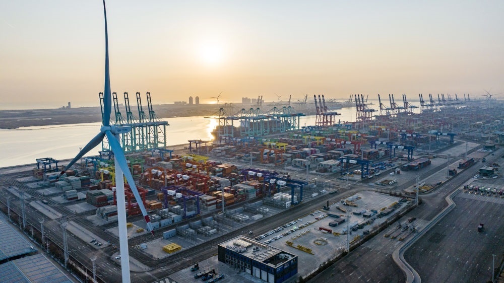 看似平常的碼頭作業(yè),背后卻另有玄機(jī)——整個(gè)過(guò)程達(dá)到了“零碳”排放。2021年底,隨著兩臺(tái)風(fēng)機(jī)葉片緩緩啟動(dòng),這座全球首個(gè)“智慧零碳”碼頭的智慧綠色能源系統(tǒng)開(kāi)始并網(wǎng)發(fā)電,通過(guò)風(fēng)電、光伏發(fā)出的綠色能源,源源不斷為碼頭生產(chǎn)提供能源。