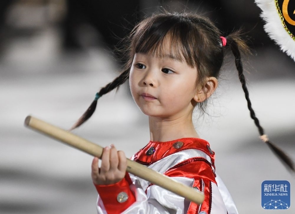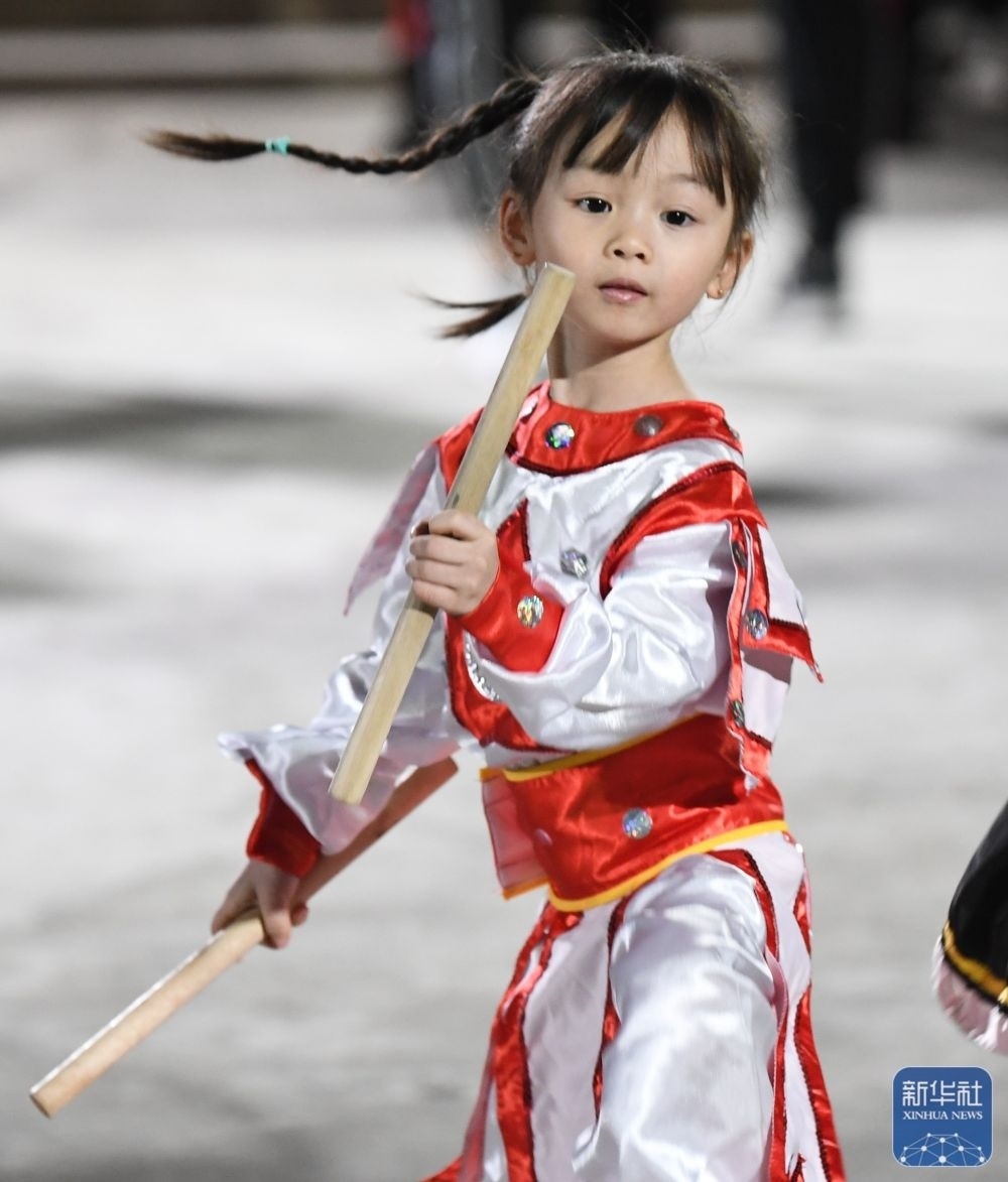 在貴嶼鎮(zhèn)玉窖村莊恩琪家的客廳里,擺著小鼓、小鈸、“小蛇”道具和“迷你版”英歌槌。莊恩琪的父親莊镕強(qiáng)是玉窖村玉和興英歌隊(duì)中的一名鑼鼓手。莊恩琪常跟著父親到英歌隊(duì)的排練場(chǎng),看著英歌隊(duì)“敲鑼打鼓跳英歌”,耳濡目染中對(duì)英歌舞產(chǎn)生了濃厚的興趣。 當(dāng)激昂的鼓點(diǎn)響起,莊恩琪變得專注,掄起小槌跟著隊(duì)員們舞動(dòng)起來(lái),“又猛又萌”的動(dòng)作讓圍觀的村民不時(shí)報(bào)以笑聲和掌聲。?