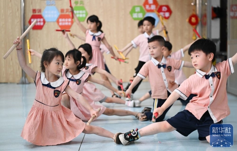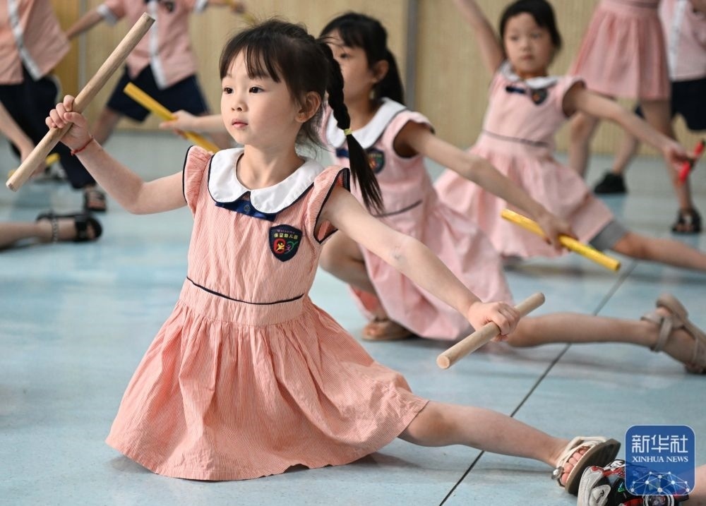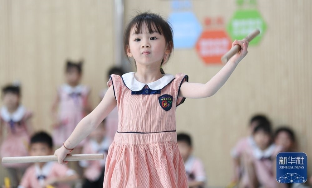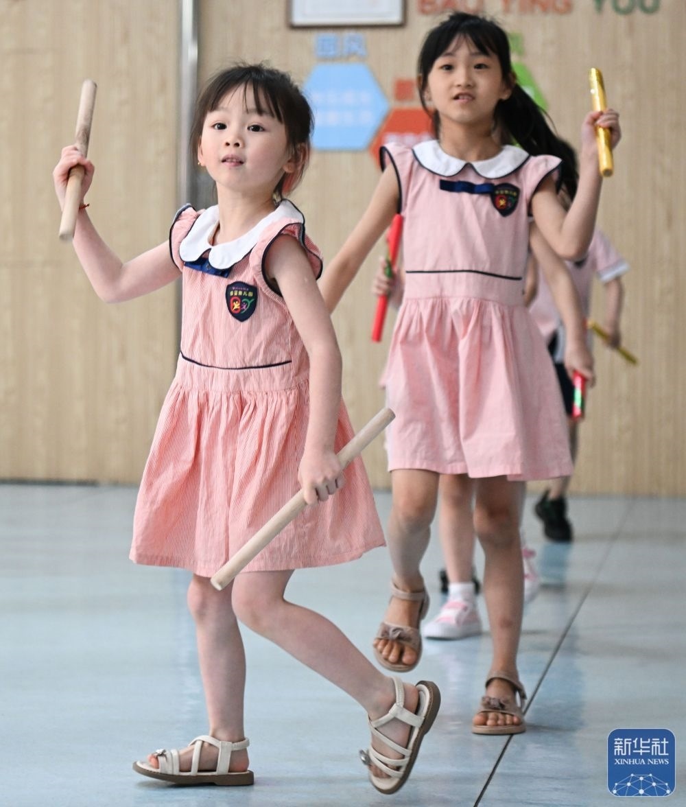 5月29日,在汕頭市貴嶼鎮(zhèn)北林保嬰幼兒園,莊恩琪(前)在練習(xí)跳英歌舞。