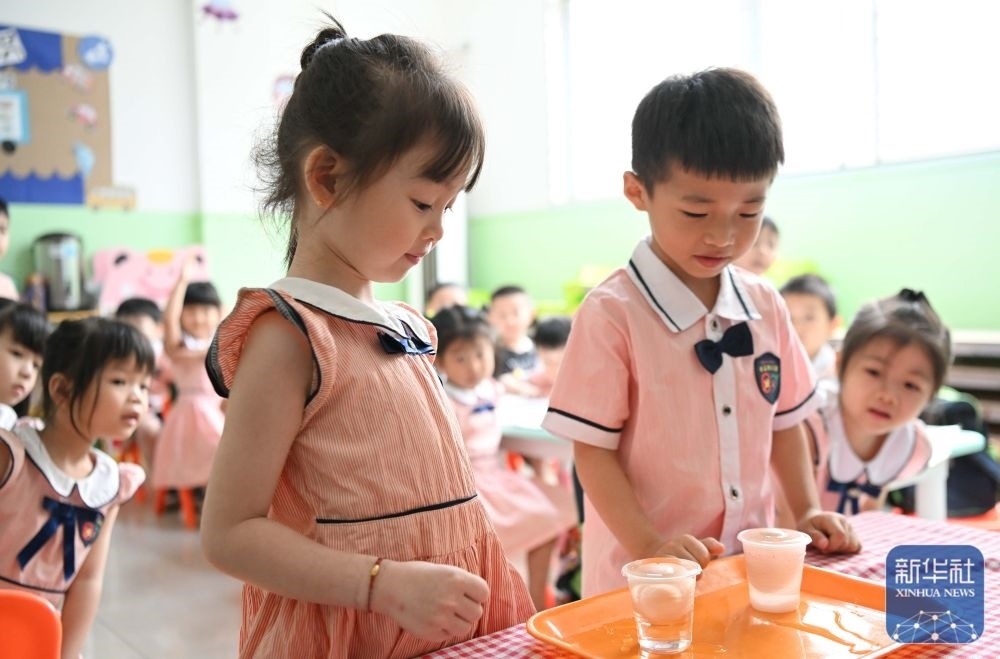 5月29日,在汕頭市貴嶼鎮(zhèn)北林保嬰幼兒園,莊恩琪(右)和同學(xué)在課堂上。