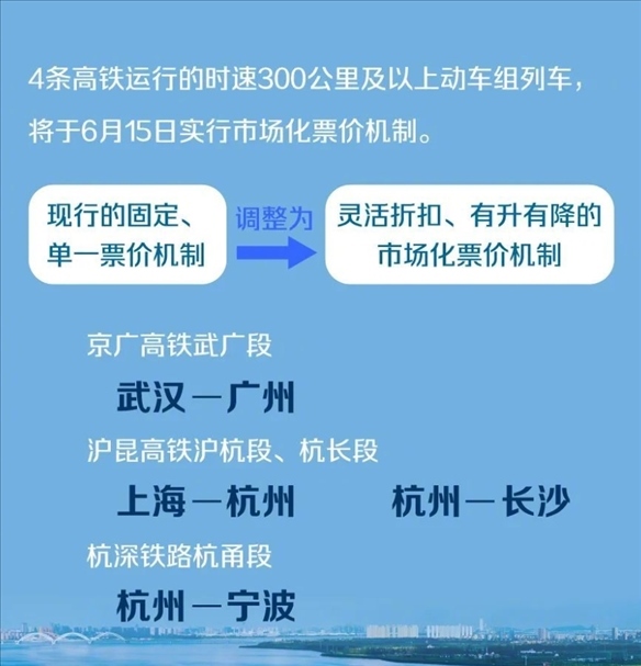·6月1日開(kāi)售實(shí)行市場(chǎng)化票價(jià)機(jī)制的4條高鐵車票,最低55折。