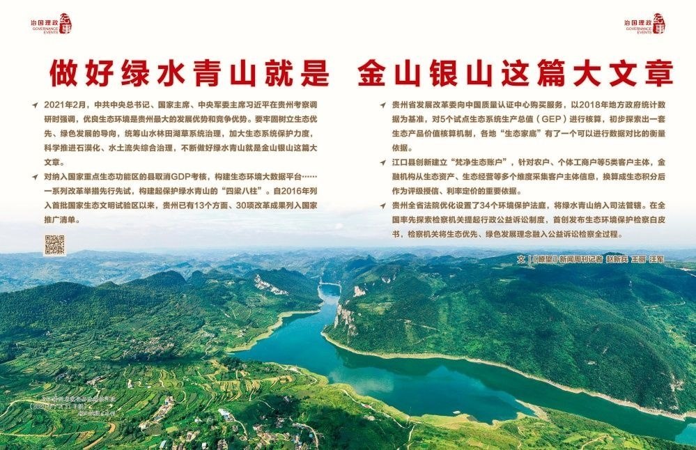 ◇2021年2月,中共中央總書(shū)記、國(guó)家主席、中央軍委主席習(xí)近平在貴州考察調(diào)研時(shí)強(qiáng)調(diào),優(yōu)良生態(tài)環(huán)境是貴州最大的發(fā)展優(yōu)勢(shì)和競(jìng)爭(zhēng)優(yōu)勢(shì)。要牢固樹(shù)立生態(tài)優(yōu)先、綠色發(fā)展的導(dǎo)向,統(tǒng)籌山水林田湖草系統(tǒng)治理,加大生態(tài)系統(tǒng)保護(hù)力度,科學(xué)推進(jìn)石漠化、水土流失綜合治理,不斷做好綠水青山就是金山銀山這篇大文章。