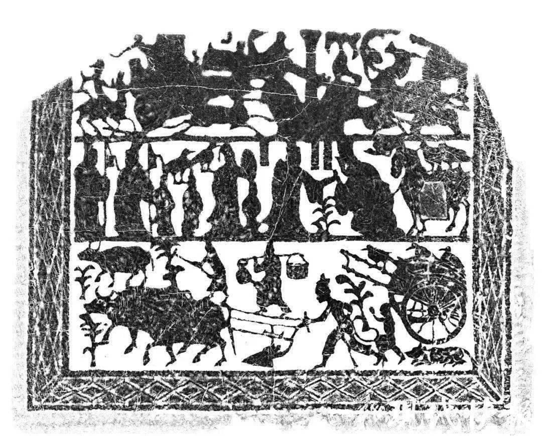 江蘇徐州出土的《牛耕圖》漢畫像石顯示,一個農(nóng)民扶犁犁地,犁由二牛牽拉。一人揚手撒種子跟在扶犁后面。他的后面停著一輛車,車旁臥著一只狗。旁邊有一個趕牛者,后面有一人挑著擔子,像是送食物的。