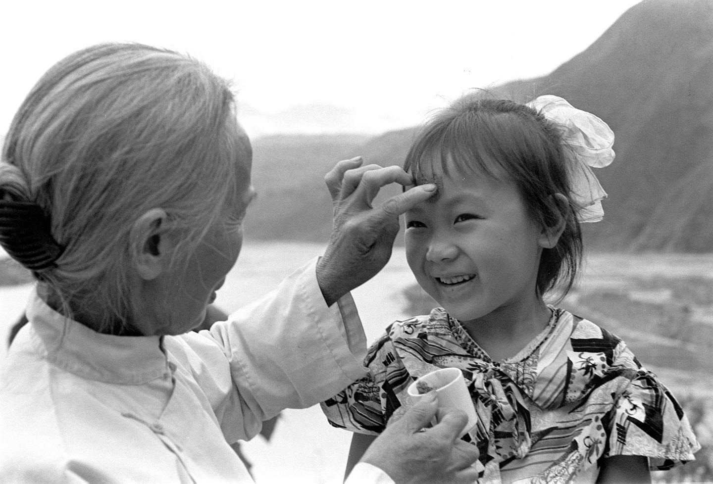 1982年,湖北秭歸的一位老人給小孫女點(diǎn)雄黃。每逢端午節(jié),給小孩額頭點(diǎn)上用酒浸過的雄黃,表示可以驅(qū)毒避邪、平安幸福。