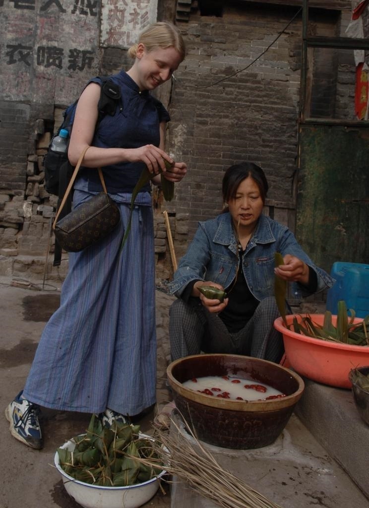 2006年5月31日,在山西省平遙縣街頭,一名外國游客在學(xué)習(xí)包粽子。