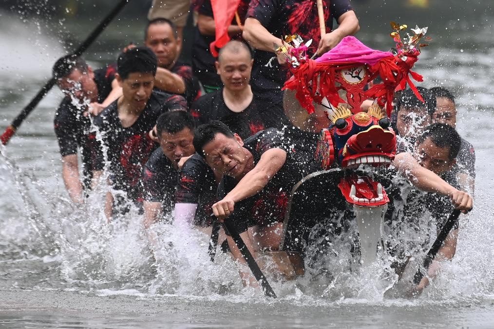 2023年6月22日,村民在杭州西溪國家濕地公園的蔣村龍舟勝會上劃龍舟。蔣村龍舟勝會于2011年被列入國家級非物質(zhì)文化遺產(chǎn)名錄。