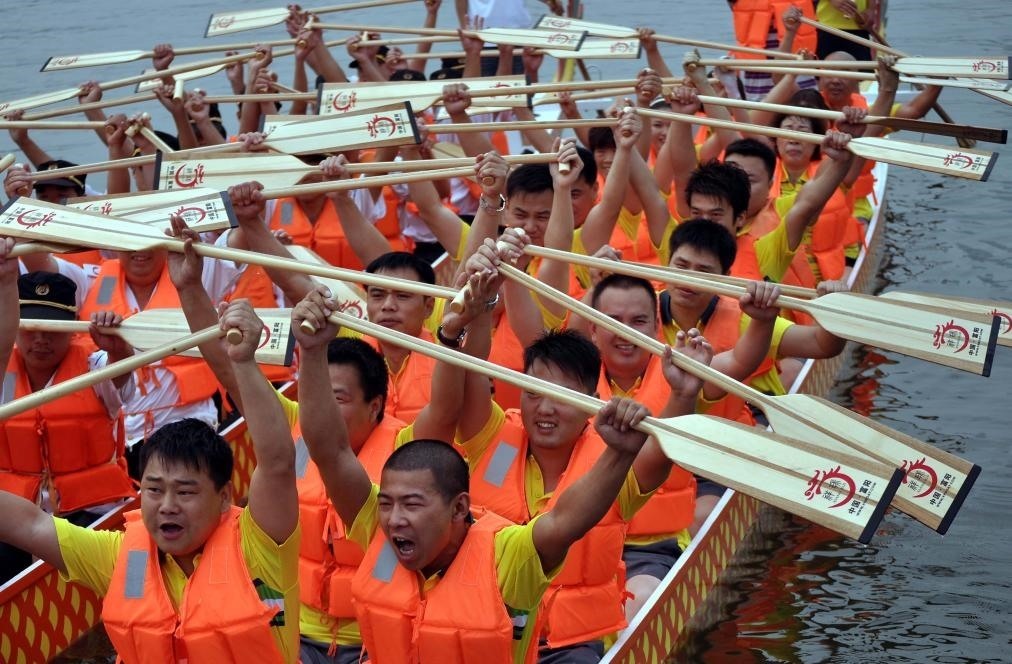 2011年6月6日,在河南省鄭州東區(qū)的如意湖上,舉行了一場龍舟挑戰(zhàn)賽,兩支龍舟隊(duì)的選手們在比賽開始前舉槳大吼以壯氣勢。