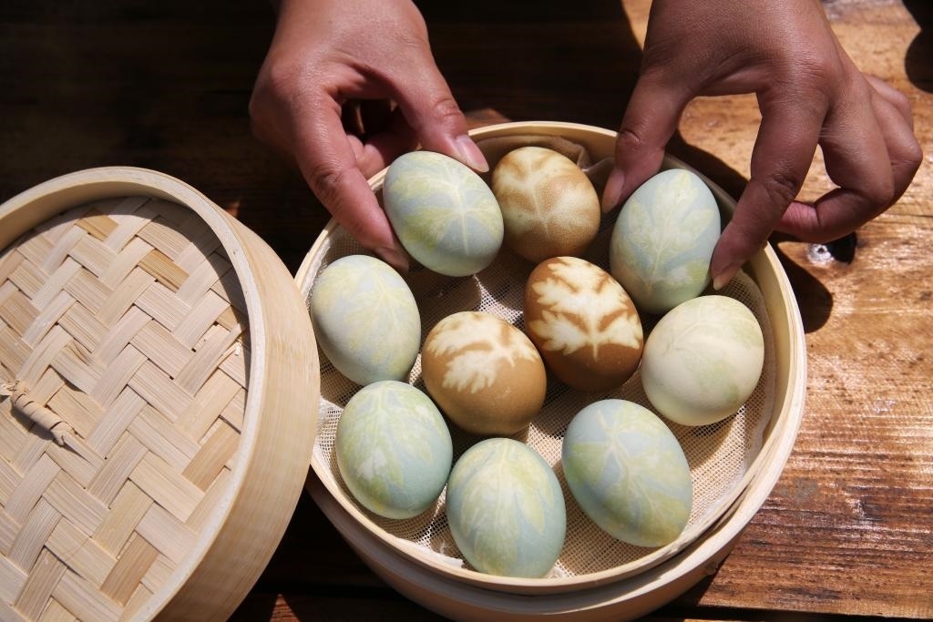 2022年5月28日,在江蘇省連云港市連云區(qū)連島街道,人們展示制作好的艾葉蛋。
