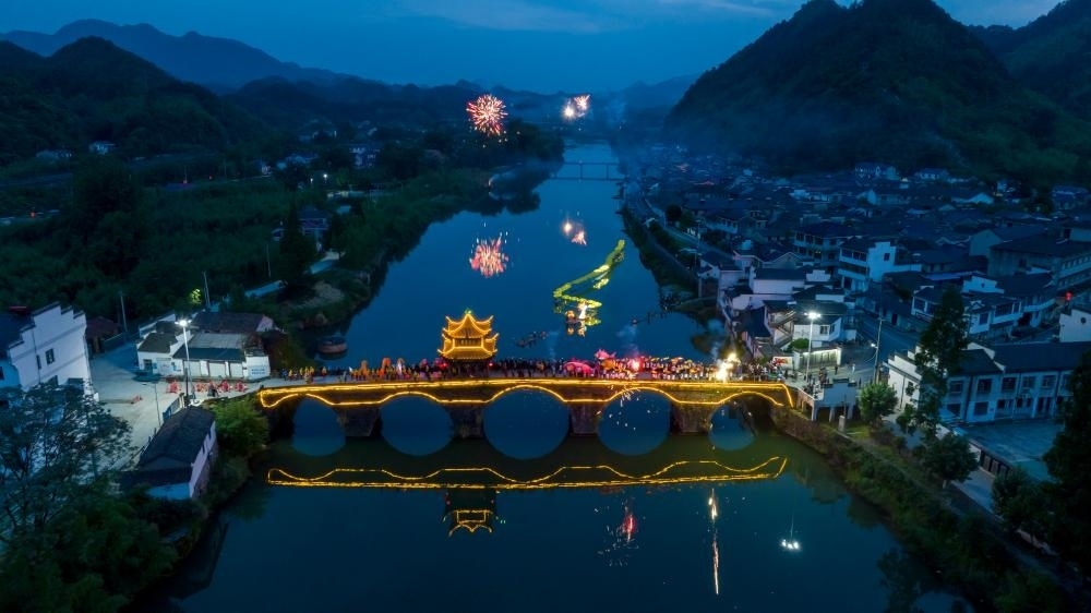 2023年6月16日,在安徽省寧國市胡樂鎮(zhèn),“魚燈”“河燈”和“龍燈”相互輝映。胡樂鎮(zhèn)的“魚燈”“河燈”“龍燈”表演歷史悠久,每逢佳節(jié),村民們就自發(fā)組織起來在鄉(xiāng)村巡回表演。