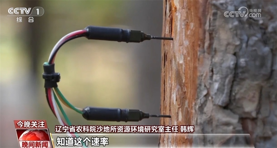 記者在采訪時(shí)看到,一棵樹(shù)的樹(shù)干上插了兩根探針,據(jù)遼寧省農(nóng)科院沙地所資源環(huán)境研究室主任韓輝介紹,這是用來(lái)監(jiān)測(cè)樹(shù)干水分的。通過(guò)監(jiān)測(cè)兩根探針之間的溫差,他們就能夠計(jì)算出這棵樹(shù)的液流速率。知道這個(gè)速率,他們就可以了解這棵樹(shù)的生長(zhǎng)狀態(tài),這個(gè)實(shí)驗(yàn)的最終目的,是想得出在單位面積上到底有多少棵樟子松最合理。