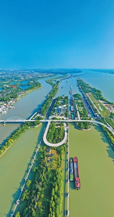 生態(tài)保護(hù)船只有序通過揚(yáng)州邵伯船閘。本報(bào)記者 雷 聲攝