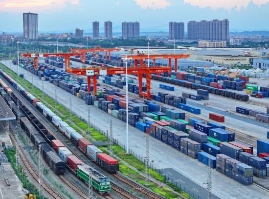 9月4日,江西省贛州市南康區(qū)贛州國(guó)際陸港貨場(chǎng),集裝箱整齊排列,進(jìn)出口貨物正快速有序裝卸。(受訪者供圖)