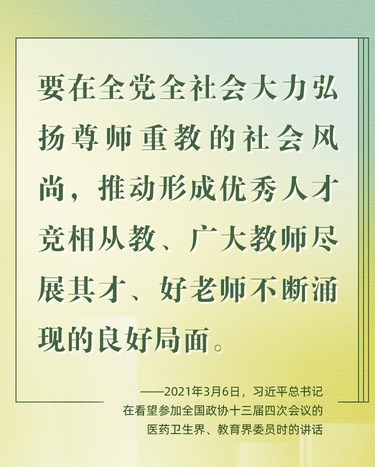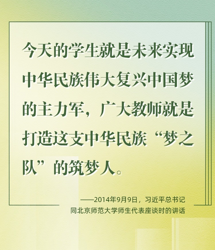因為熱愛,所以一生堅持。老師是中華民族“夢之隊”的筑夢人,是新時代的“大先生”。從傳播知識、啟迪思想、無私奉獻(xiàn),到“讓每個人都有實(shí)現(xiàn)夢想的機(jī)會”;從教書到育人,從個人到家國,從小我到大我,“培養(yǎng)德智體美勞全面發(fā)展的社會主義建設(shè)者和接班人”,老師,已然是喚起一代代學(xué)子追隨先輩、培養(yǎng)家國情懷、櫛風(fēng)沐雨、砥礪前行的力量。