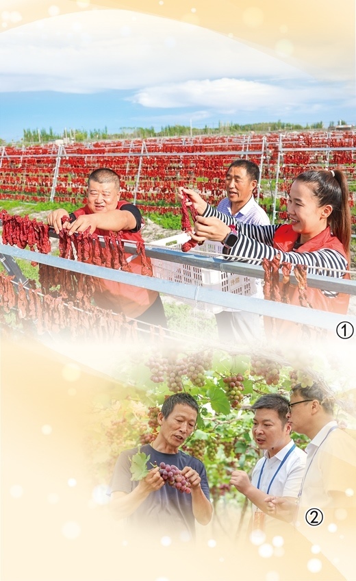 圖①:新疆維吾爾自治區(qū)博湖縣塔溫覺肯鄉(xiāng)辣椒曬場上,黨員志愿服務(wù)隊幫助村民晾曬辣椒。年 磊攝 圖②:浙江省淳安縣紀(jì)檢監(jiān)察干部走訪果農(nóng),聽取意見建議。謝航凱攝