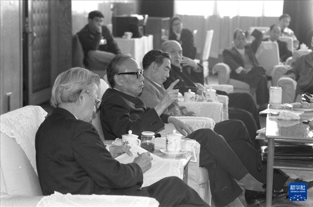1991年4月6日,任建新同志(左二)參加七屆全國人大四次會議山西省代表團(tuán)小組會,聽取代表們對最高人民法院工作報(bào)告的意見。