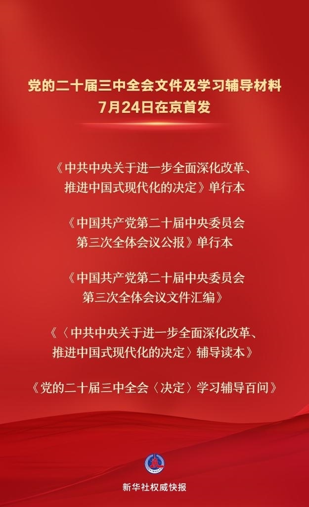 黨的二十屆三中全會(huì)文件及學(xué)習(xí)輔導(dǎo)材料7月24日在京首發(fā)