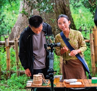 在云南景邁山大平掌古茶林,傣族姑娘仙金(右)在直播售賣(mài)普洱茶(2023年9月17日攝)胡超攝/本刊