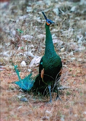 云南楚雄雙柏縣恐龍河自然保護(hù)區(qū)的綠孔雀(2023年4月20日攝)胡超攝/本刊