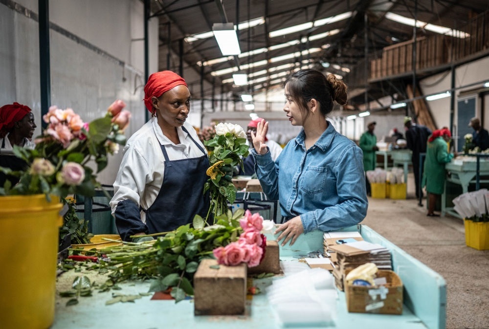 2024年5月18日,湖南璽悅國際貿易有限公司負責人黃梓楠(右)在肯尼亞納紐基的坦布濟花卉農場挑選鮮花。中國政府2021年11月宣布為非洲農產品輸華建立“綠色通道”,縮短檢驗檢疫時間,擴大關稅豁免,為肯尼亞鮮花及非洲各國的牛油果、柑橘、菠蘿等特色農產品打開了銷路。