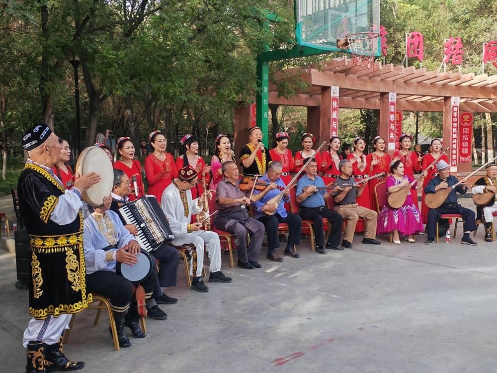 2024年9月19日,新疆庫爾勒市朝陽街道團(tuán)結(jié)社區(qū)石榴籽樂團(tuán)在為居民們表演。新華社記者 顧煜 攝