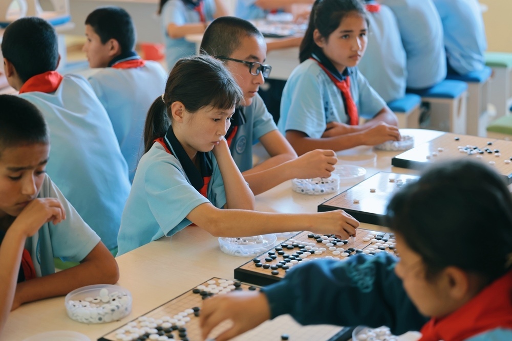 2024年9月23日,在新疆烏什縣依麻木鎮(zhèn)國家通用語言學(xué)校,學(xué)生們在下圍棋。新華社記者 任沁沁 攝