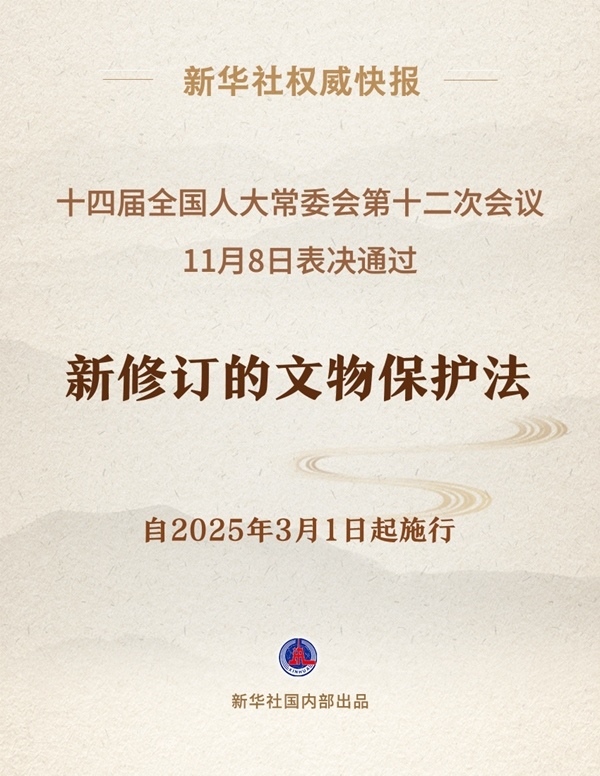 十四屆全國(guó)人大常委會(huì)第十二次會(huì)議11月8日表決通過新修訂的文物保護(hù)法,自2025年3月1日起施行。