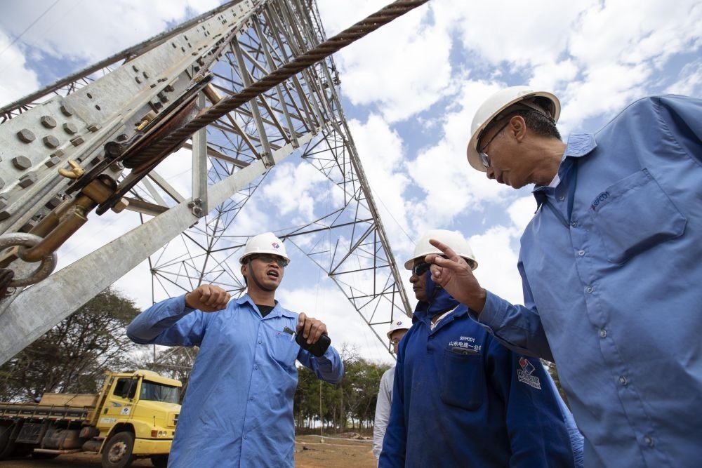 2018年8月7日,在巴西東南部米納斯吉拉斯州阿科斯市附近,巴西美麗山特高壓輸電工程二期第九標(biāo)段項(xiàng)目中方現(xiàn)場施工管理負(fù)責(zé)人(左)在施工現(xiàn)場指導(dǎo)巴方員工。美麗山水電站二期項(xiàng)目是中國國家電網(wǎng)公司首個(gè)在海外獨(dú)立投資、建設(shè)和運(yùn)營的特高壓直流輸電工程,也是“特高壓+清潔能源”在拉美的示范工程。