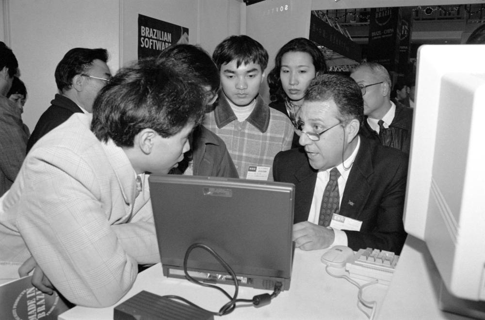 1995年12月14日,巴西外貿(mào)及合資項(xiàng)目洽談會(huì)在上海舉行。這是一位參展商向參觀者介紹巴西電腦網(wǎng)絡(luò)系統(tǒng)軟件設(shè)備。