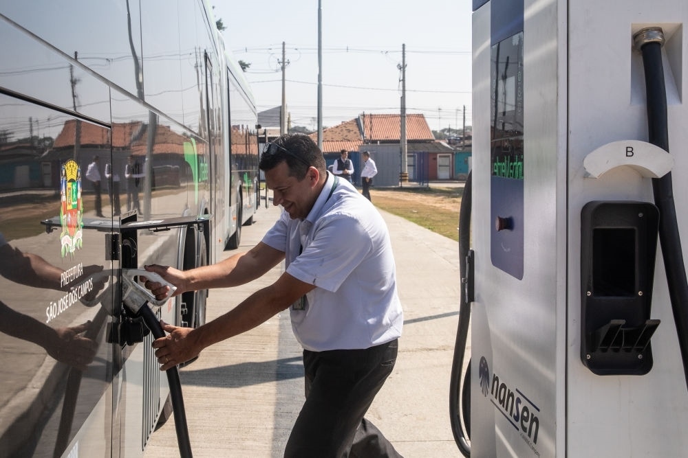 2021年11月,12臺(tái)中國制造的純電動(dòng)鉸鏈?zhǔn)酱蟀驮诎臀骱教斐恰ト魸啥潘箍财账辜冸娍焖俟幌到y(tǒng)投用。這是2023年7月12日,工作人員為中國制造的純電動(dòng)大巴充電。