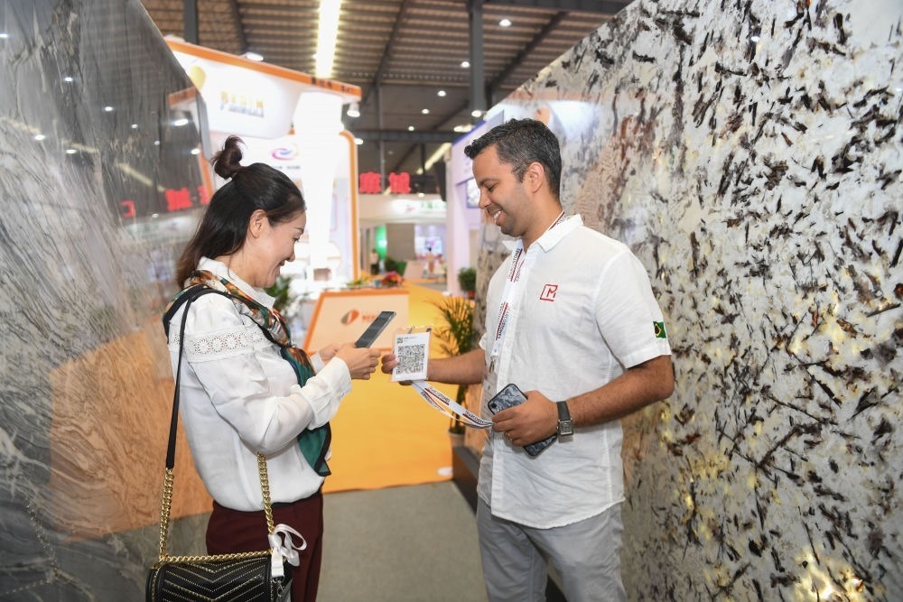2019年11月8日,巴西商人馬庫斯在福建省南安市水頭鎮(zhèn)舉辦的國際石材博覽會(huì)上向國內(nèi)客商出示自己的微信二維碼。