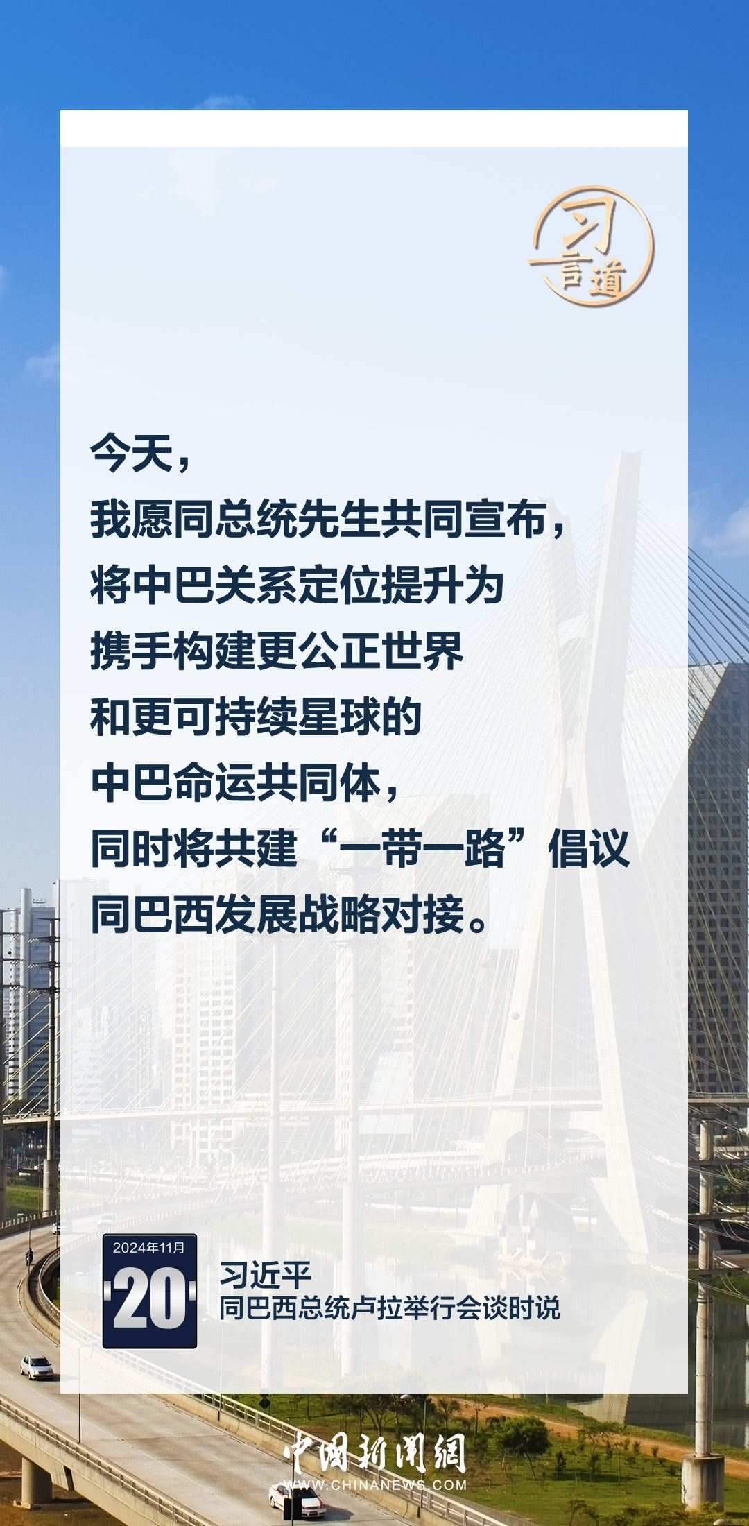 當(dāng)?shù)貢r(shí)間11月20日,中國國家主席習(xí)近平在巴西利亞總統(tǒng)官邸同巴西總統(tǒng)盧拉舉行會(huì)談。習(xí)近平指出——