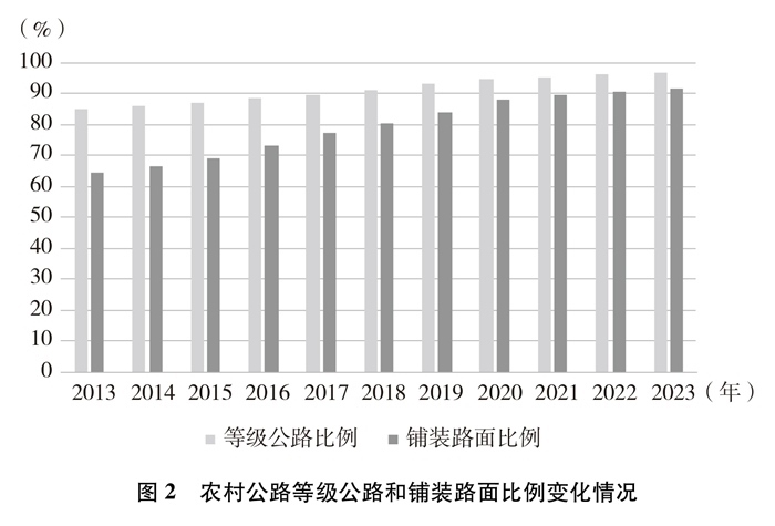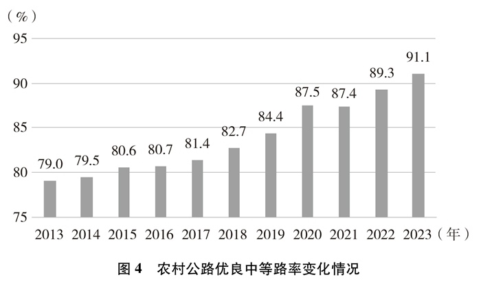 技術等級逐年提高。截至2023年底,農(nóng)村公路等級路②里程及比例分別達到445萬公里和96.8%,鋪裝路面里程及比例分別達到422萬公里和91.8%,十年間分別提高了11.9個百分點、27.2個百分點。