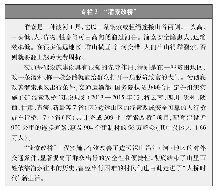 解決特殊地區(qū)出行難題。改一條溜索、修一段公路就能給群眾打開一扇脫貧致富的大門。為了保障偏遠山區(qū)百姓安全出行,推動“溜索改橋”建設,專項資金支持、精心組織實施,用3年時間徹底改善了溜索地區(qū)出行條件(專欄3)。推進“直過民族”③和人口較少民族聚居區(qū)農(nóng)村公路建設,解決民族地區(qū)交通閉塞的突出問題,加快民族地區(qū)脫貧致富步伐。